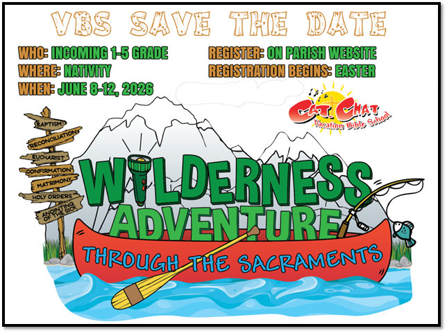 We are excited for this summer's VBS! The registration will open soon to all students who will be in 1st-5th grade starting in the Fall. Be on the lookout for more updates and reminders as we get closer. It will run from June 8th - 12th, 2026, from 9:00 a.m. - 12:00 p.m. (drop off begins at 8:50 a.m.). This year's cost is $30 and $15 additional per child. Safe-Environment Trained (SET) adult volunteers can get a discount on campers. If you have any questions, please call the Faith Formation Office at 813.689.9101.